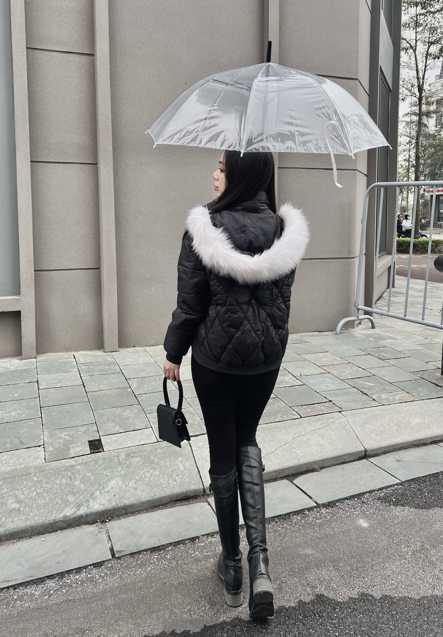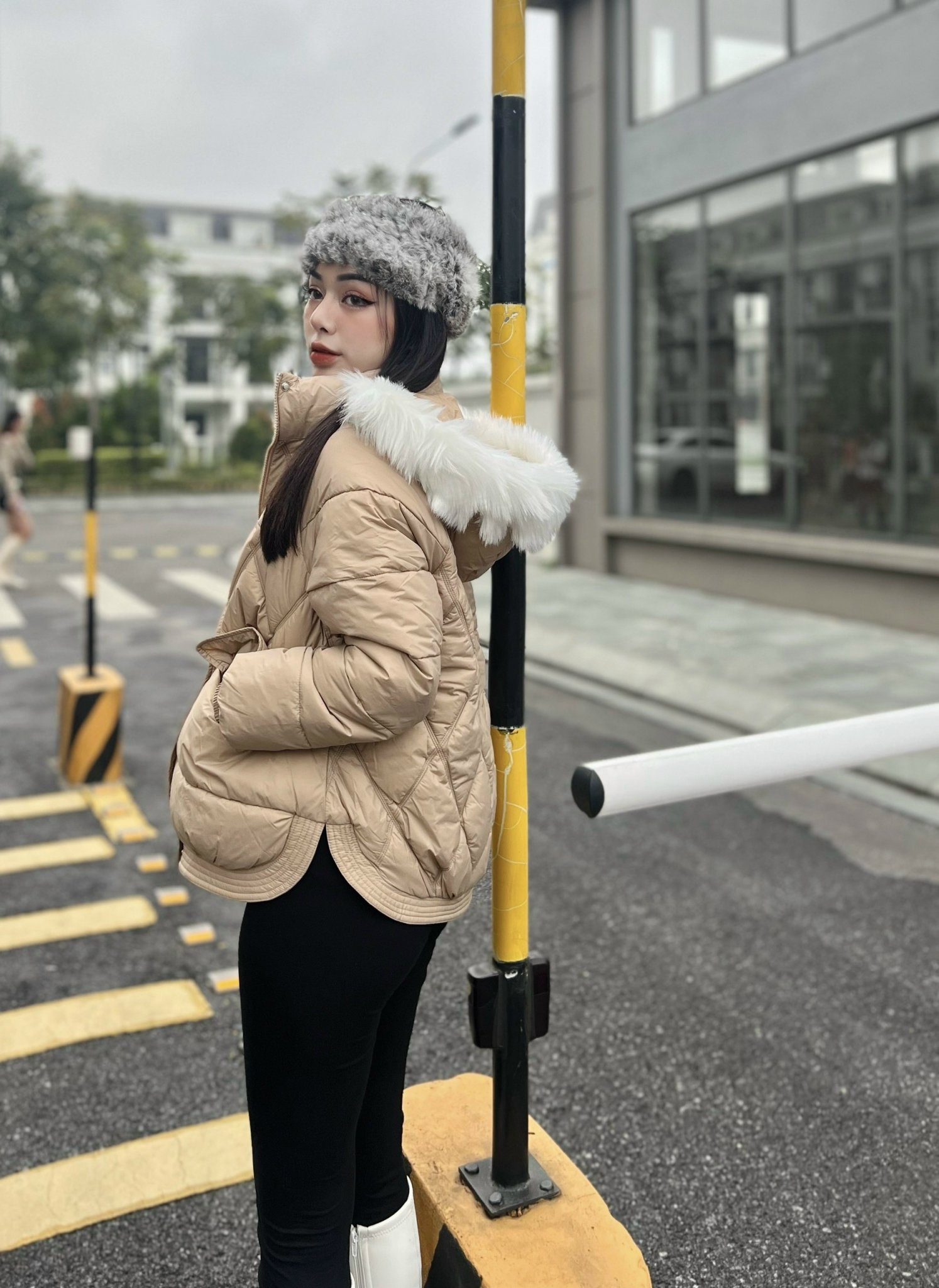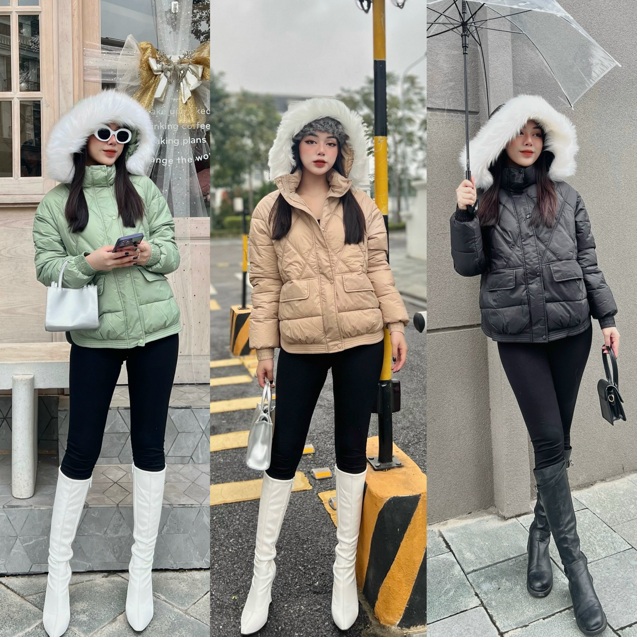 Áo khoác phao nữ 4981 mũ lông trắng tháo rời