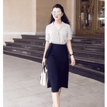 - Kiểu dáng: Áo sọc phối chân váy xẻ